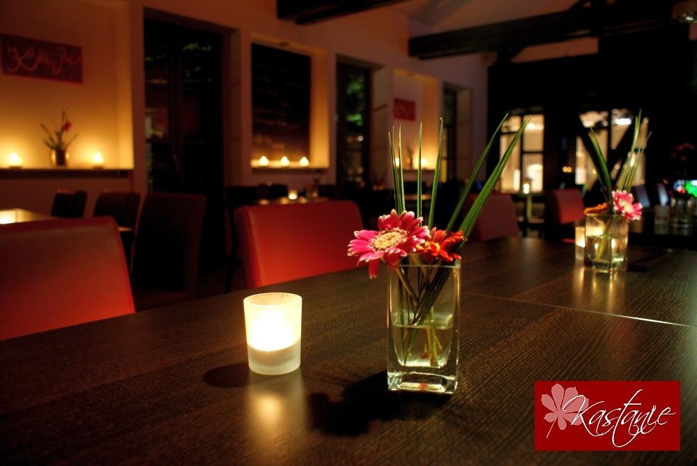 Das Restaurant an sich überzeugt eindeutig mit geschmackvoller Inneneinrichtung und architektonischer Kunst. Holzmöbel mit warmen Farben schmücken das Interieur der Kastanie, die ihr Zuhause in einem wunderschönen Fachwerkhaus gefunden hat. Der gemütliche Gastraum ist durch hohe Türen mit dem Innenhof verbunden, der in den Sommermonaten einige schattige Plätze verspricht, unter denen man sich einfach treiben lassen kann um die Spezialitäten des Hauses in vollen Zügen zu genießen. Hier wächst auch ganz gemütlich und glücklich ein Kastanienbaum, der gleichzeitig der Namensgeber für dieses liebenswürdige Restaurant ist.